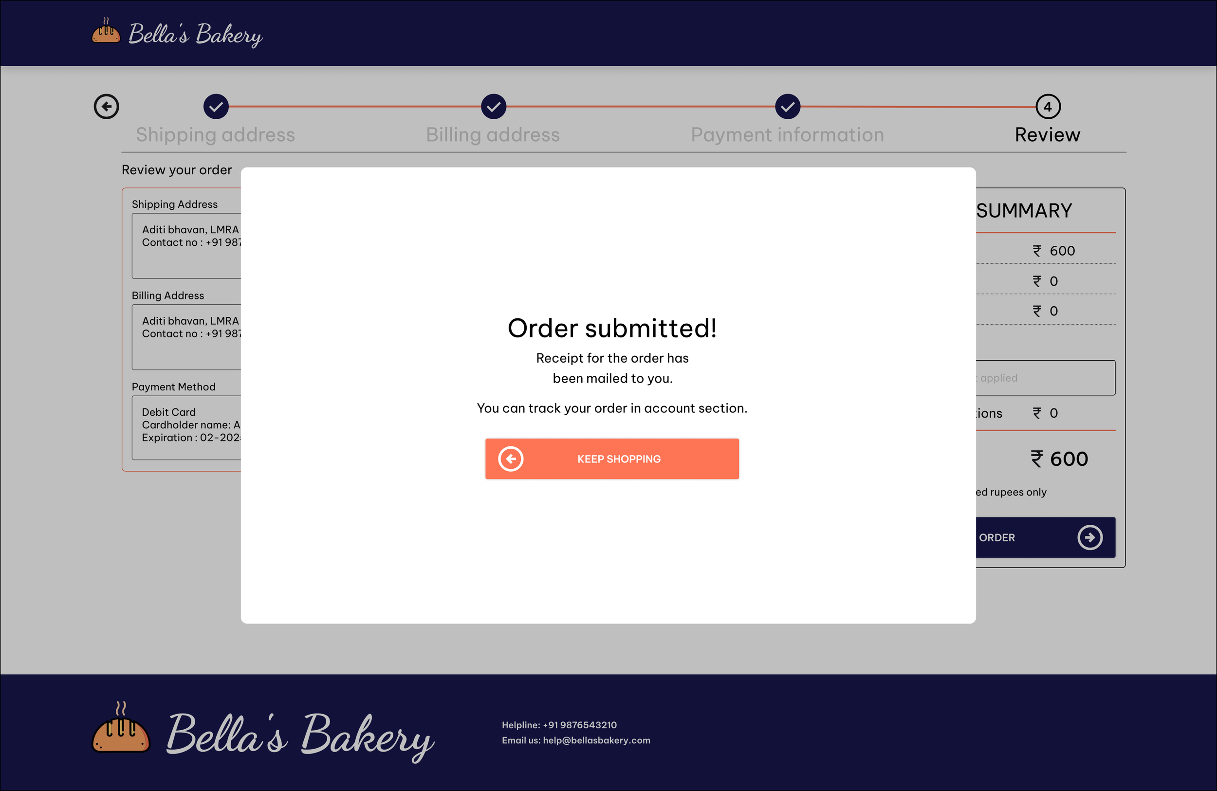 After successful completion of the checkout process the user is greeted with a pop up saying “Order submitted”.