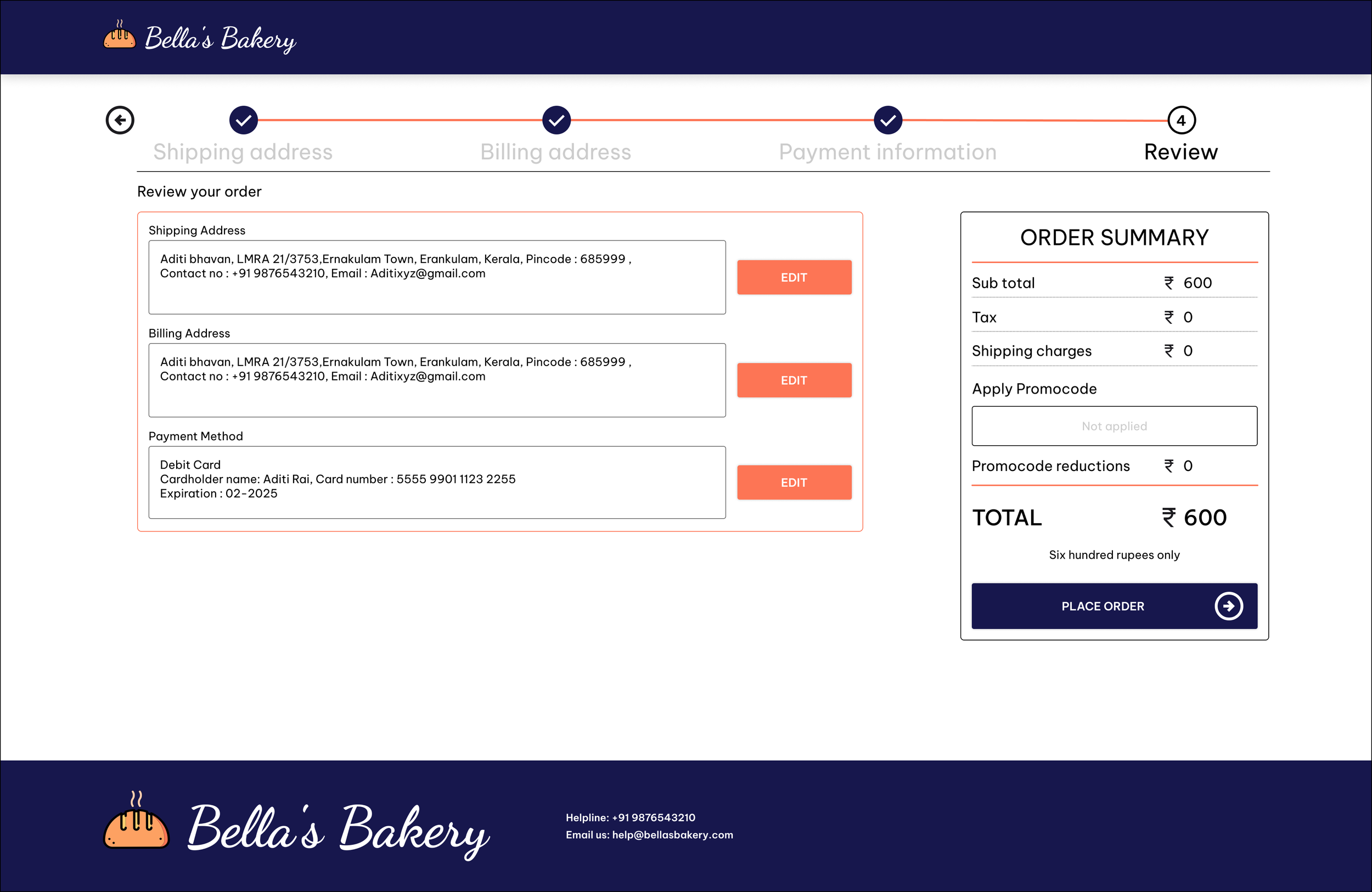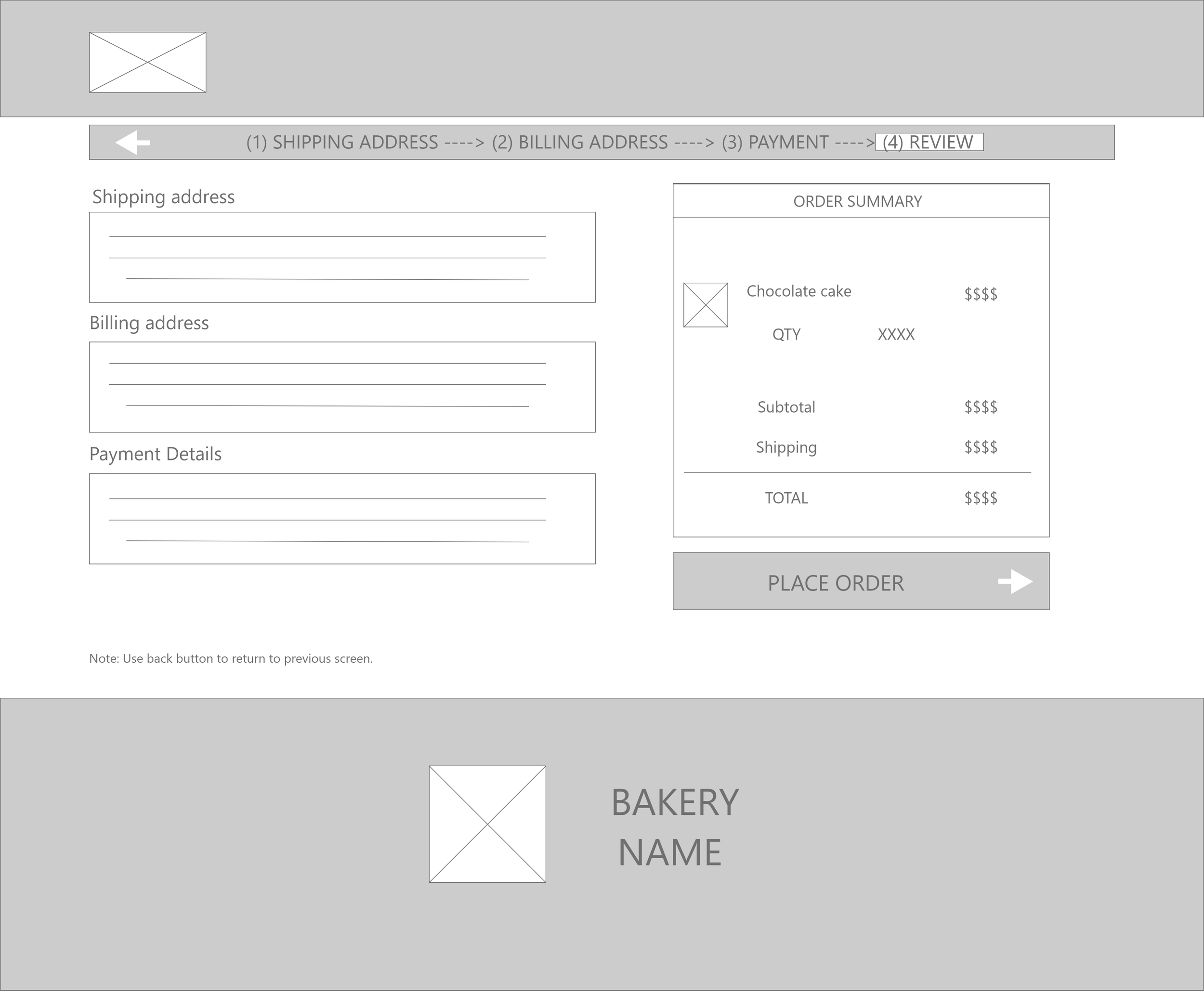 After making a completed set of digital wireframes, I created a low-fidelity prototype. The primary user flow I created is placing order for a cake which could be used in a usability study.