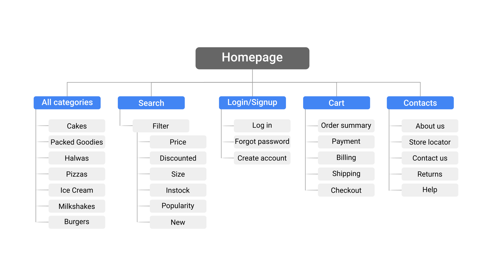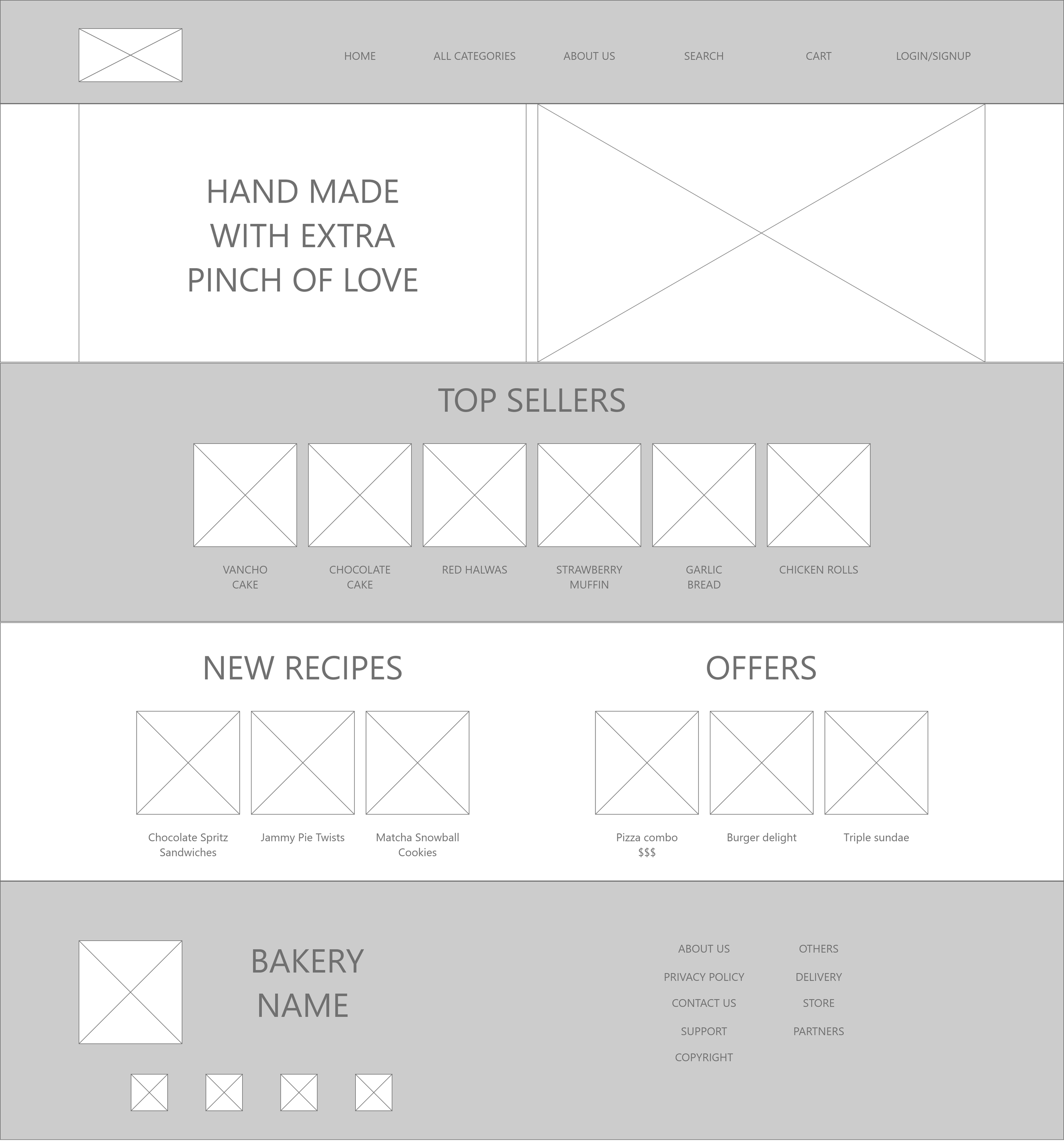 Dividing the bakery website into different smaller sections provide better navigation. As it's a bakery website there are a lot of products of offer. So I have grouped similar products into categories and also provided necessary filters in search.