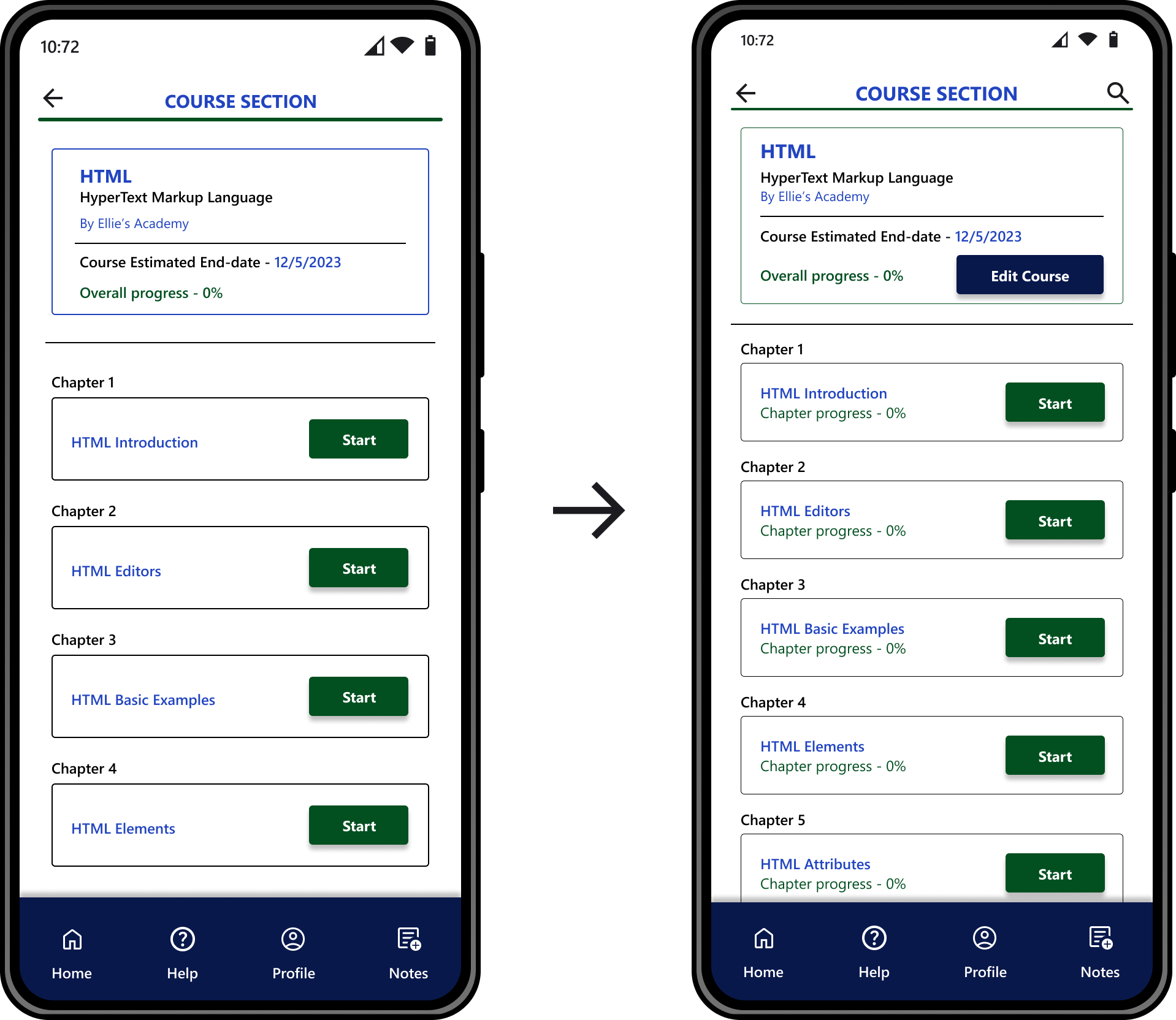 Progress status and edit course are added.