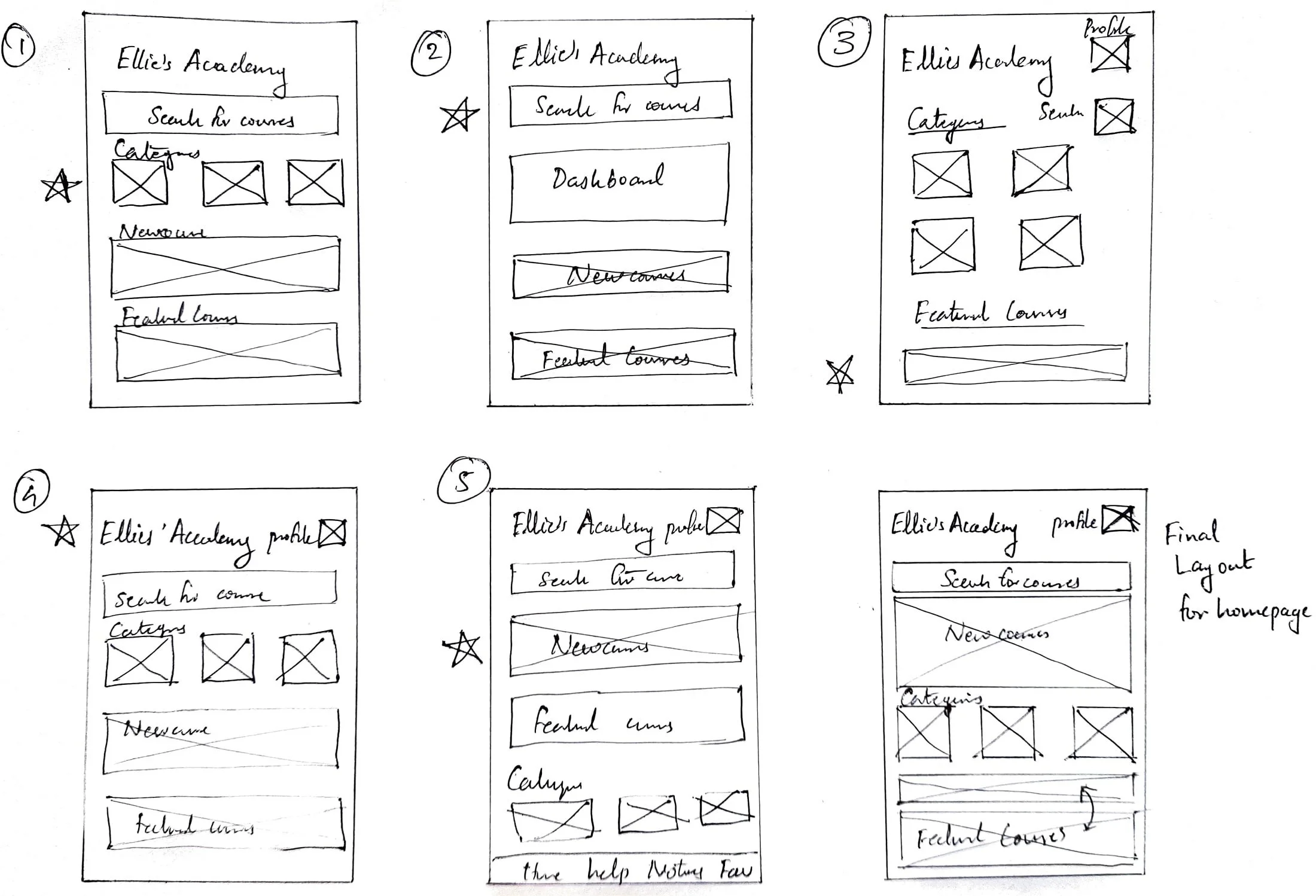 Stars were used to mark the elements of each sketch that would be used in the initial digital wireframes for home screen.