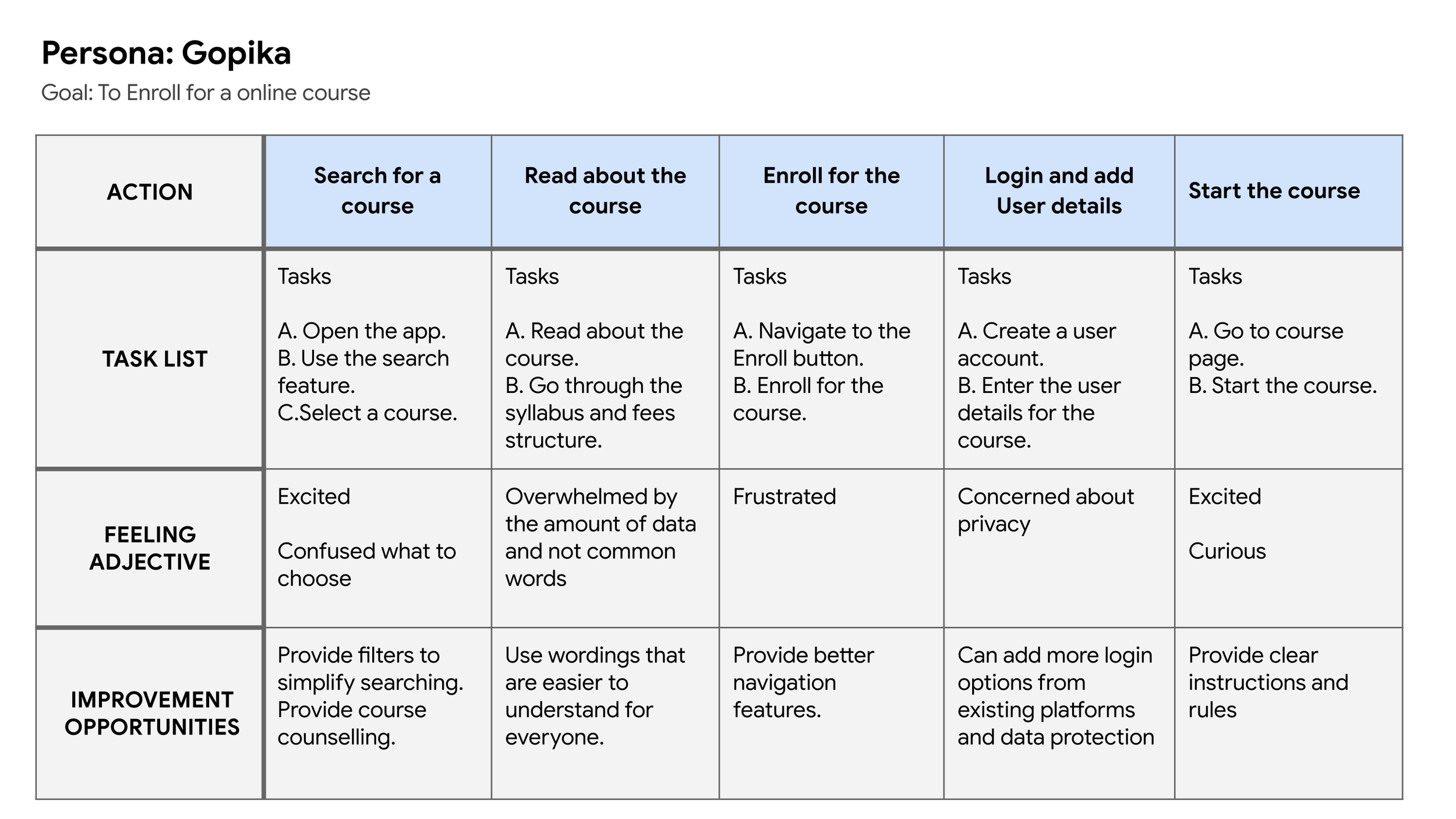 Mapping Gopika’s user journey revealed how helpful it would be for users to have access to a dedicated education app for technical skills.